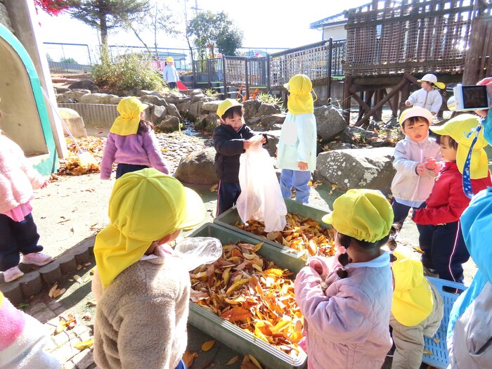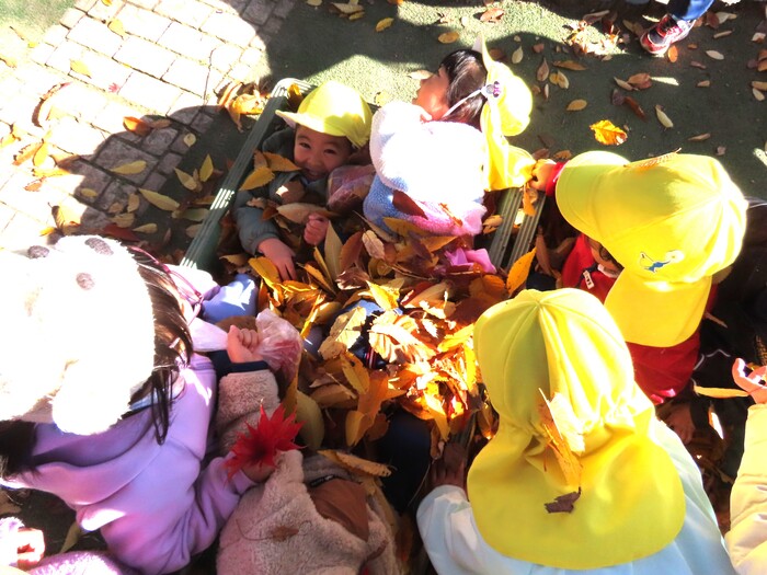 子どもたちは落ち葉のカサカサする音と感覚を全身で楽しんでいるようです。