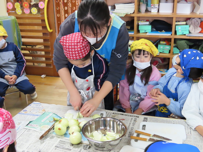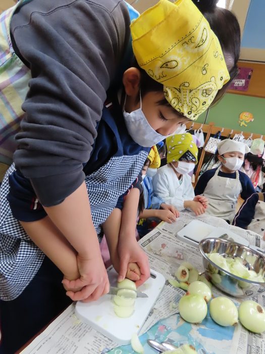 先生に手伝ってもらって玉ねぎにも挑戦。「目が痛い!」