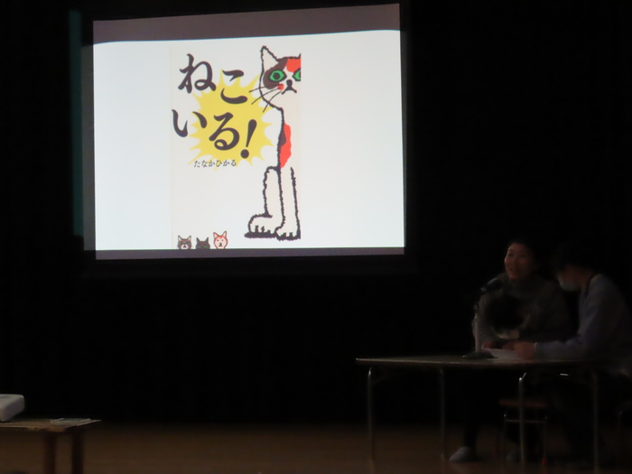 大きなスクリーンに映る絵本にみんな大盛り上がり。