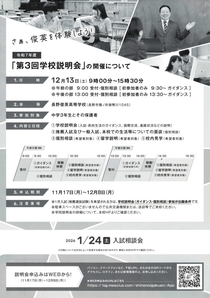 【中学3年生ならびに保護者のみなさまへ】令和7年度学校説明会について