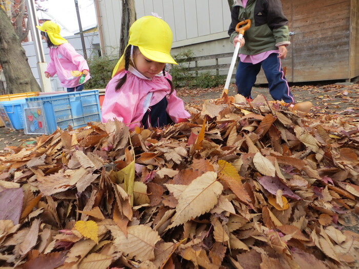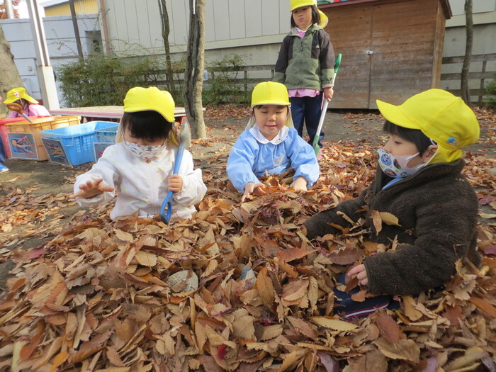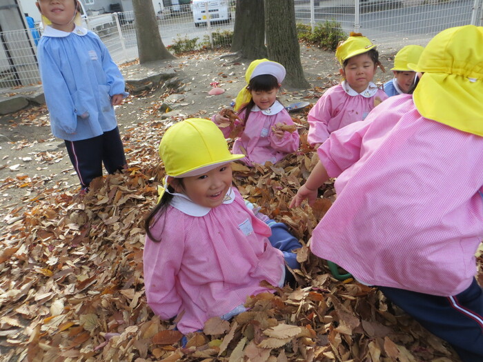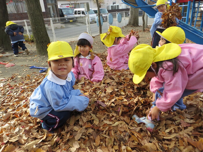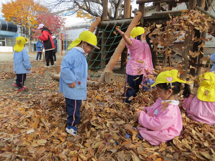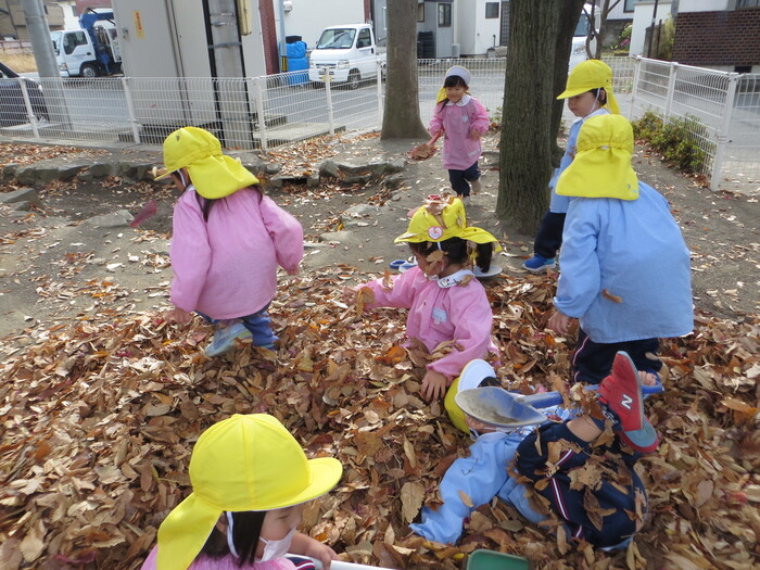 ブログ 2025.12.12 落ち葉となかよし! 春には、きれいなお花をたくさん見せてくれた桜の木から、今度はビッグな落ち葉のプレゼント! 「遊びの名人」の子どもたちにとっては、落ち葉はステキな遊びのお相手!晩秋の自然の中で、思いっきり気持ちよく遊びます!