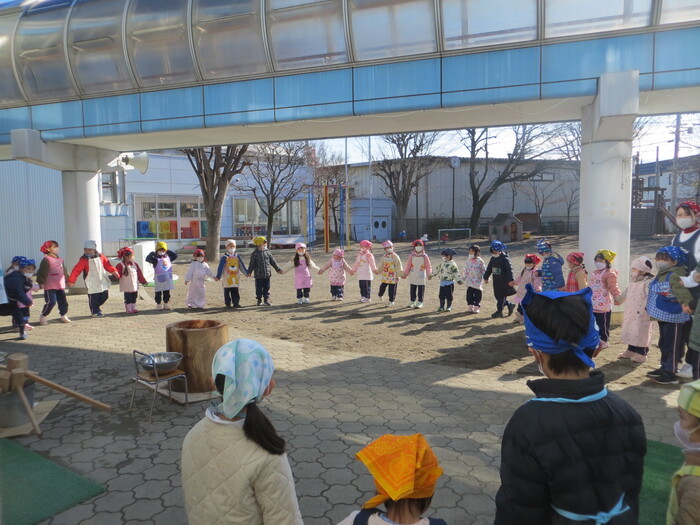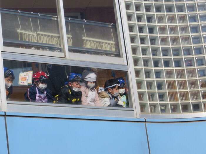 姉妹学級ごとに集まって、みんなの掛け声に合わせて、