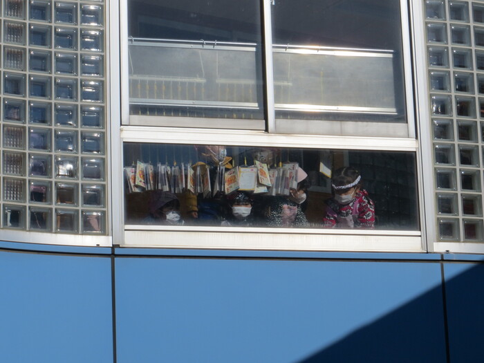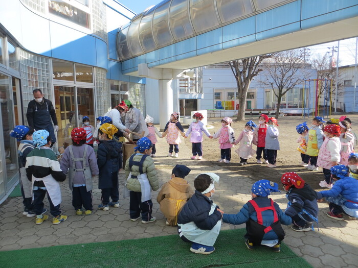 姉妹学級ごとに集まって、みんなの掛け声に合わせて、