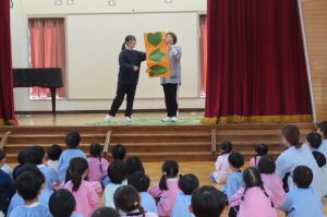 サツマイモが焼けるまで、お遊戯室に集まってクイズやお話を楽しみました。