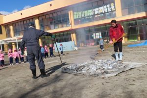 クラスで焼きイモの準備を済ませたら、熾火の中にサツマイモをいれてちょっと一息