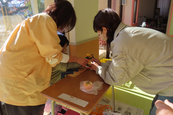 ひまわり教室とメダカ教室のお友だちは、干し柿作りにも挑戦しました☺