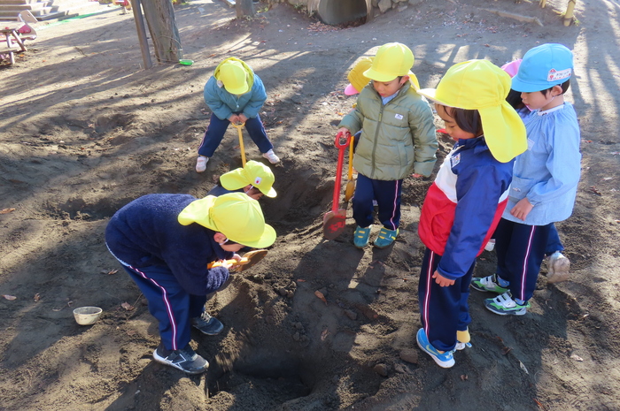 掘った穴に足を入れて、お友だちと開通を確認していました。