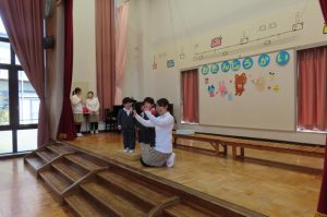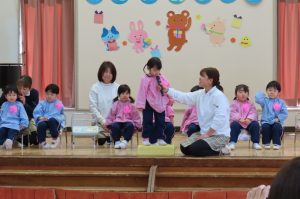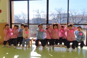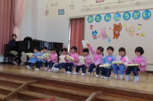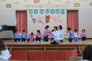 1・2・3月生まれとかぜ組のお友だちの誕生日会がありました。年少、年中、年長さんは合同での誕生日会です。