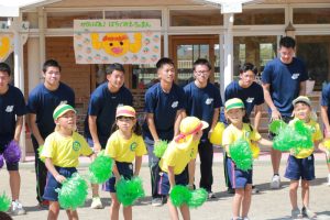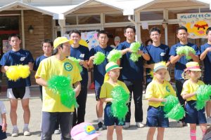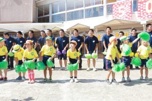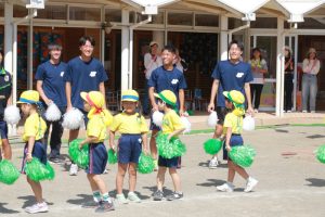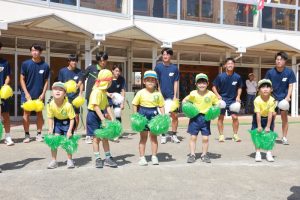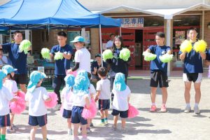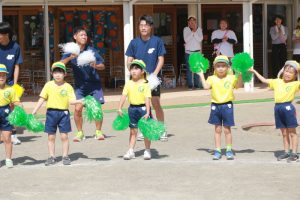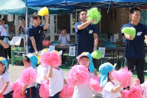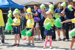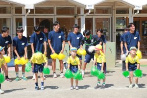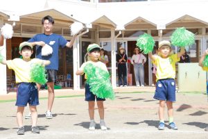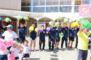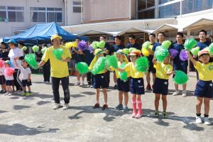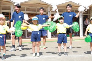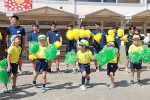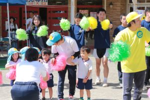 9月27日の運動会当日は、ご来場いただいた保護者の方々、地域の皆様、未就園児の皆さん、卒園児さんに加えて、俊英高校スポーツ健康科学コースの皆さんの参加をいただき、運動会がより楽しく、より元気に、よりみんなで喜びを分かち合う、思い出がたくさん詰まった50周年記念運動会となりました。俊英高校の皆さんとの振り返りたくなる楽しい思い出の一コマ一コマを、日頃お世話になっております写真館さんが、写真に収めて幼稚園に届けてくださいましたよ。届いた写真を眺めているうちに、あの時の歓声がまたよみがえって参りました。何枚か紹介させていただきます。