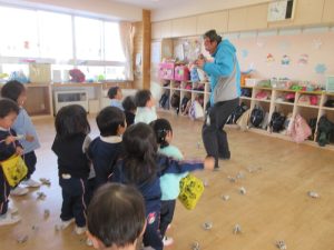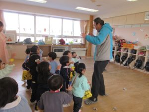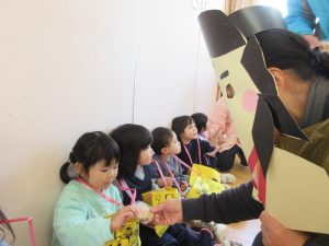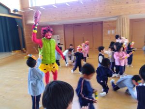 今日の幼稚園は、鬼さんの訪問に大騒ぎ。窓越しに鬼さんの姿を見かけたいちご組さんは、先生にしがみついて大粒の涙が・・・遊戯室では年少さんから年長さんまで鬼さんを外に追い払おうと、自分たちも手作りの鬼のお面をかぶって、団結して立ち向かう子どもたち。手作りの豆をぶつけたり鬼さんを追いかけたり、あっちもこっちも大騒ぎでした。最後は、みんなのパワーにさすがの鬼さんも、へとへとになり、優しい心、強い体、大きくなる喜びの気持ちをみんなに残して、逃げ帰りました。毎年のように、この時期になると必ずやってくる青鬼さんんと赤鬼さん。子どもたちが大好きな赤鬼さんと青鬼さんですが、一緒に仲良く遊ぶにはまだまだ時間がかかるようです。年少さんはたくさん涙を流しながらも強い気持ちで、みんなで力を合わせて豆をぶつけていました。年中さんは、逃げ回る鬼さんを追いかける力がついて来ました。年長さんくらいになると、だんだん仲良しになってきて、鬼さんへの親しみも湧いてくるようです。