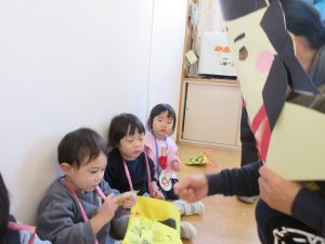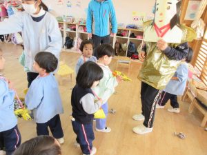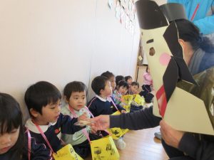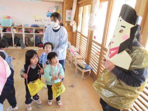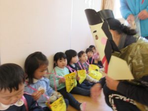 <いちご組さんのお部屋に、鬼さんが訪問>「あれっ、鬼さん怖くない…〇〇先生、鬼さんだったの?」