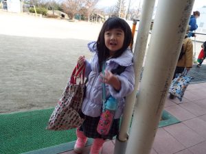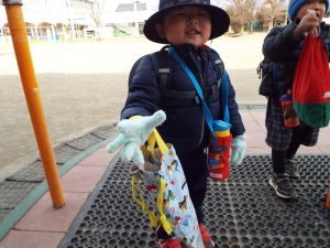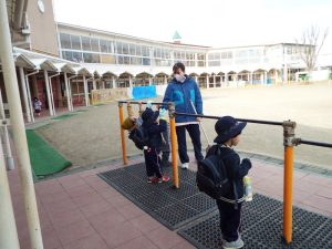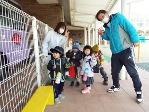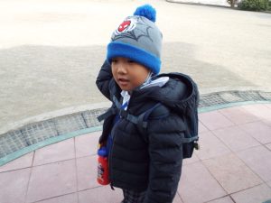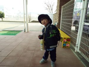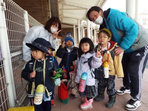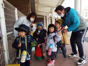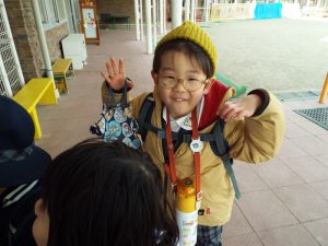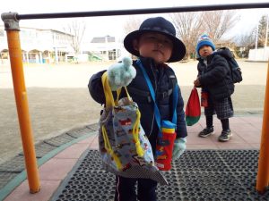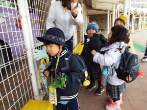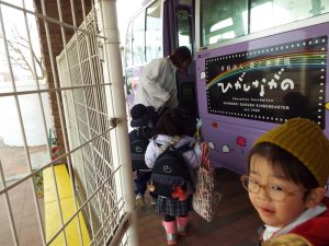 インフルエンザの流行により、学級閉鎖となったのは年長組と年中組。幼稚園に登園してきたお友だちは、いちご組と年少組のお友だちのみです。二階の年中、年長さんのお部屋はとても静かでした。朝の自由遊びの時間も、いつもは学級を越えてお兄さんお姉さんと一緒に遊んだりボールを蹴ったりしている光景がみられる園庭ですが、今朝は年少さんがだけが静かに先生とお散歩していました。お帰り時、紫バス2便に乗車するお友だちがの声が聞こえてきました。いちご組さんと年少組さんの5人です。年中組、年長組のお兄さん、お姉さんはお休みのため、園舎もバスも、運転手の先生もみんな寂しそうです。