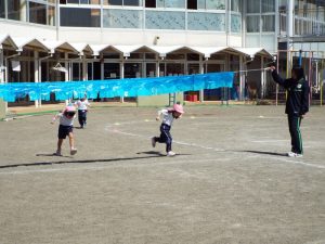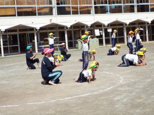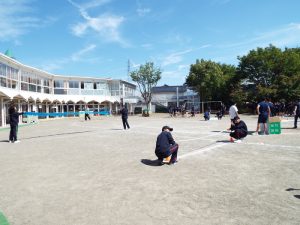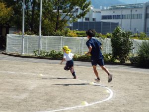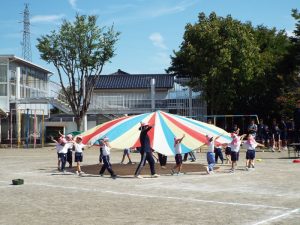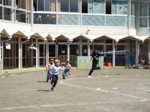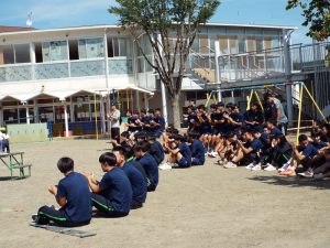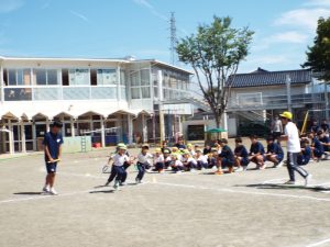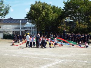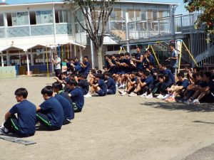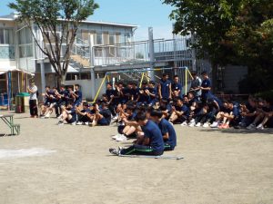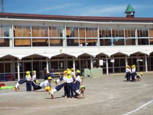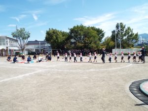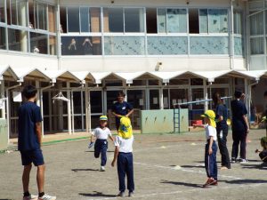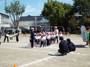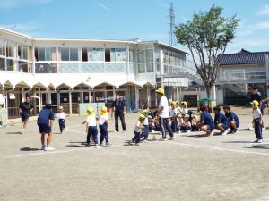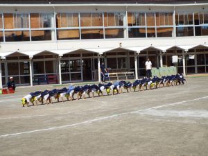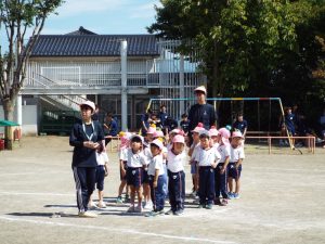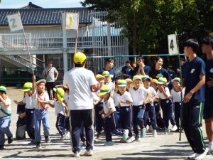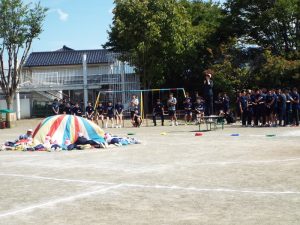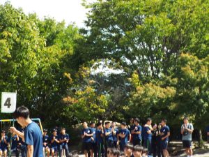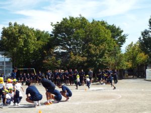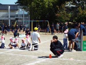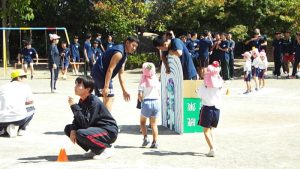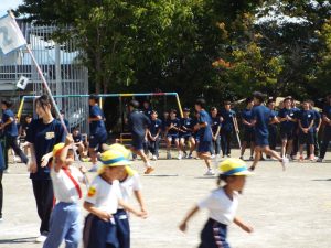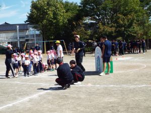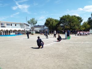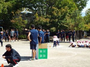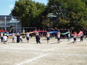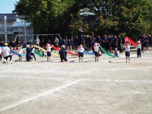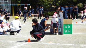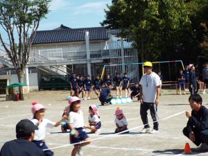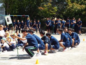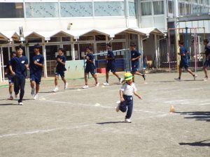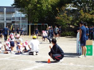 種目の道具の出し入れ等も、積極的に行い、子どもたちへの声がけも優しくて、実施前は50名を超える高校生の皆さんが満足してくれる日になるだろうかと不安な思いを抱えて、ドキドキしながらお迎えしましたが、50名を超える皆さんの人間味あふれ、さわやかで、迫力もパワーもある姿に出会えて、こうして一緒に運動会の練習ができたことは、子どもたちにとって口では言い表せない素晴らしい体験の場になりました。