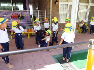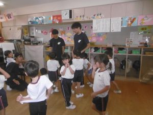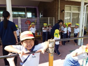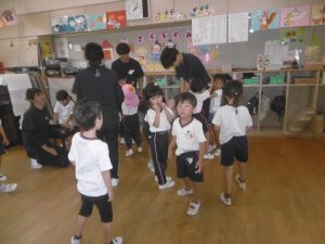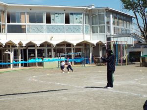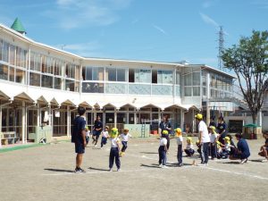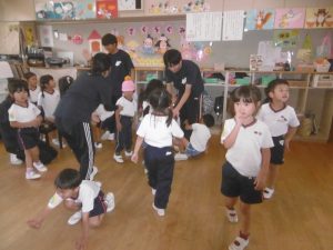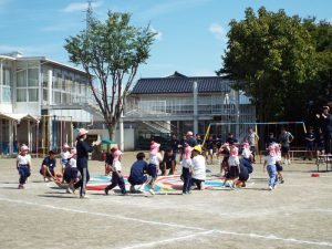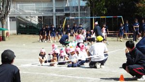 最初に行ったのは綱引きです。「年中・年長組43名」対「俊英高校サッカー部10名」との対決は1回戦目はサッカー部の勝利。2回戦目には、子どもたち側に、応援が入ってくれたおかげで、子どもたちが勝利しました。3回目は何と俊英高校20名対20名の対決です。2回戦行い、引き分けとなりましたが、綱を引く迫力がとにかく素晴らしくて、子どもたちはこれまでこんなにすごい綱引きを見たことがないので、目を真ん丸にしてびっくりしたり感動したり、本当に最高の綱引きを見せていただきました。とにかくかっこよかったです。なかなかこのような体験は、子どもたちにも幼稚園の先生方にもないことなので、それが幼稚園の園庭で繰り広げられていることに、ますます感動しました。多分、幼稚園児だけでなく、高校生のこんなに素晴らしいパワー、迫力を、地域の皆さんも最近みたことはないのでは?こんなにさわやかで生きる力にあふれた地元の高校生がいるということを近隣の皆様にも見ていただきたかったです。