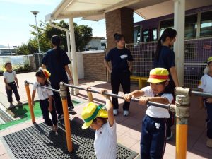 <年中・年長組と俊英高校スポーツ健康科学コースの皆さんの姿から>幼稚園では27日に予定されている運動会に向けて、毎日練習に励んでいます。そんな子どもたちに今日は応援団が大勢駆けつけてくださいました。俊英高校でスポーツ健康科学を学んでいる皆さんです。50名を超える生徒さんが、練習する子どもたちを応援したり、種目に使う用具の準備をしたり、一緒に参加したり…園庭が活気に満ち溢れていました。