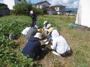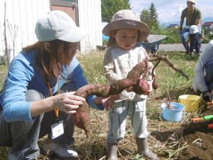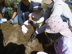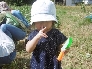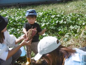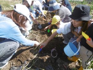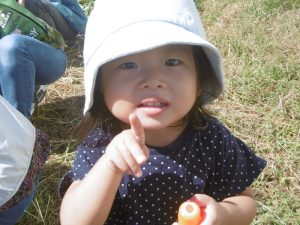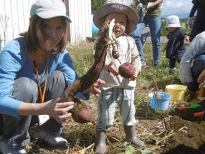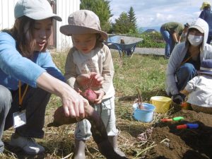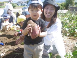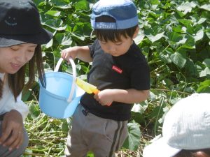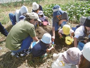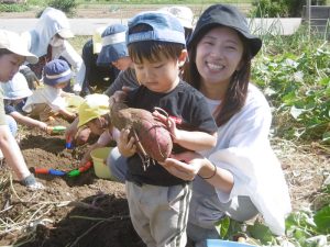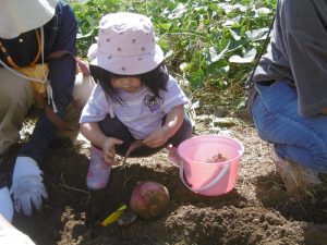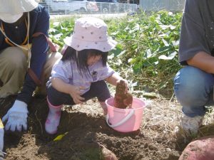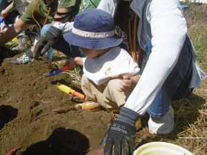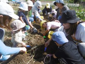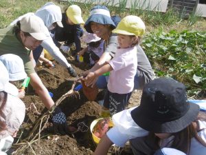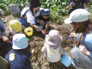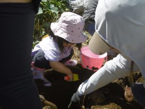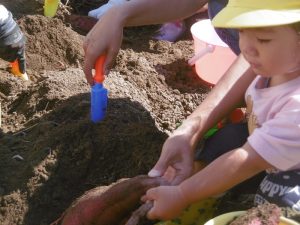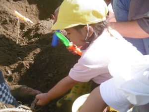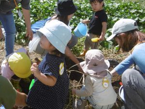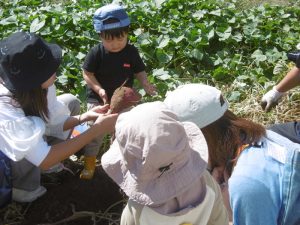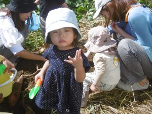 ブログ 2025.10.04 「どんどこあそぼっこ」1歳児教室さんの「さつまいもほり」 今週の「どんどこあそぼっこ」の皆さんは、春に畑に植えたさつまいもを、いよいよ収穫に行きましたよ。とっても大きなお芋が掘れました。1さいじさんだって、力持ちです。スコップで一生懸命掘って、お芋をバケツに入れていました。