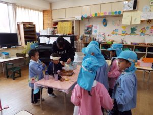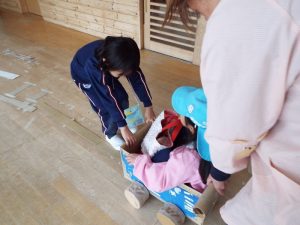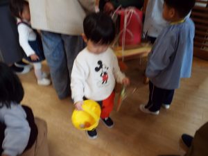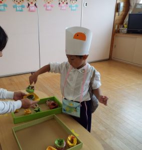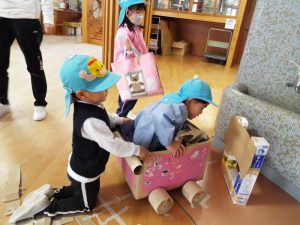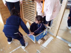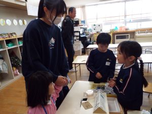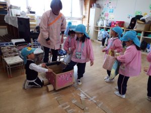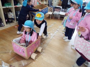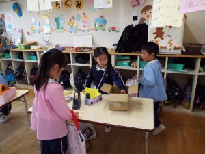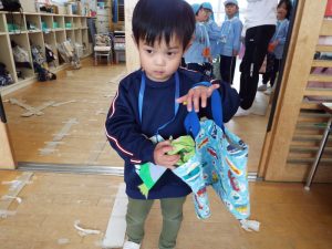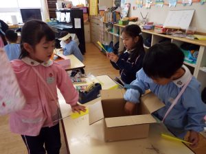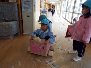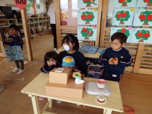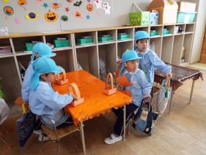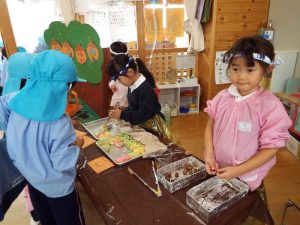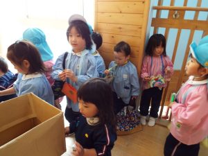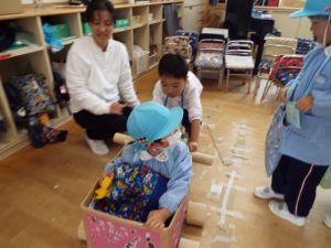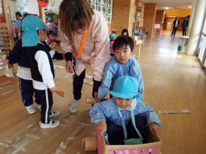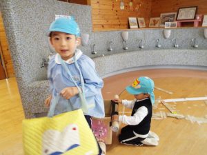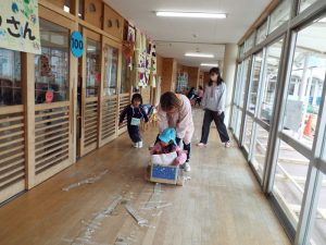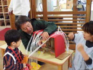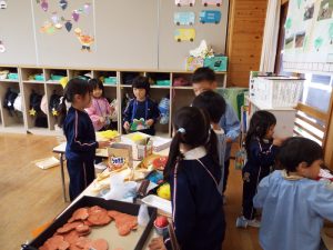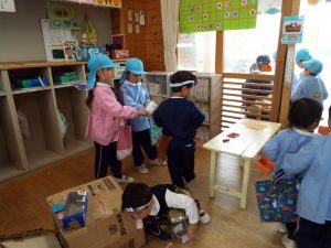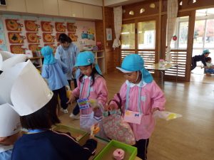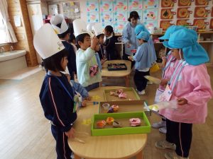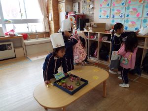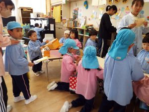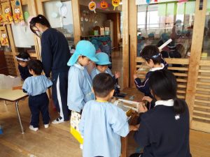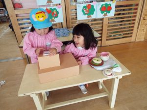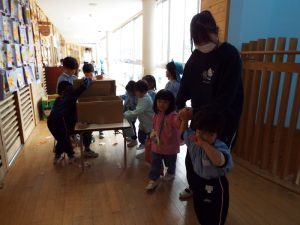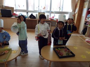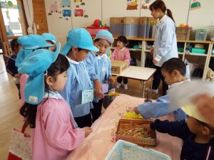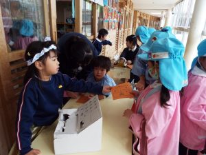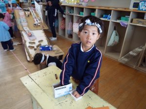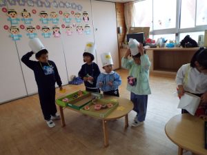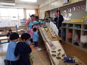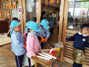 最終日ともなると、商店街は売り切れのため休店予定のお店が出たり、修理中のお店があったり、体験型のお店はあちこちが傷んだりしていましたが、小さなクラスのいちご組さん、年少組さんの所には、いつのまにか年中組・年長組さんが出向いて、開店に間に合うようにお店のお手伝いをしていました。 おかげで休店しそうなお店も、無事大切なお客様を迎える準備が整いました。