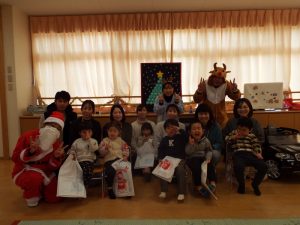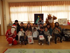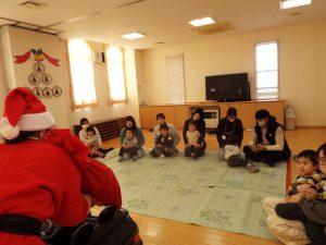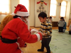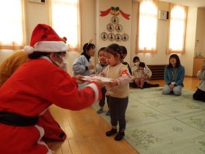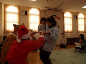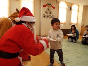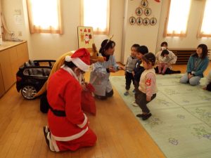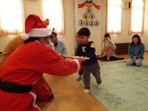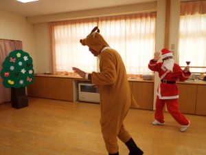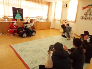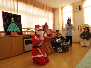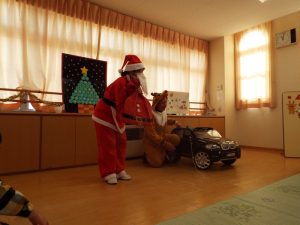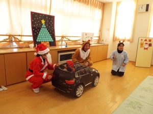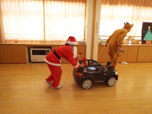 しばらくすると、今度は、サンタさんとトナカイさんが登場!雪がないのでトナカイさんの運転で車に乗ってやってきたサンタさん。タムタム教室のお友だちにプレゼントを届けに来たようです。