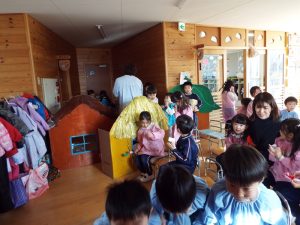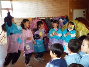 手作り衣装を着て、手作りマイクをつけた素敵なアーティストたちの歌とダンスが始まりました。2歳児さん、年少さん、年中さんたちは、思い思いにペンライト?を振ったり手拍子したり、楽しそうに参加していましたよ。