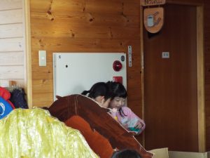 <真剣に見つめる裏方の皆さんです。カメラマン、みつけましたか?スタンドマイクも手作りですよ。>
