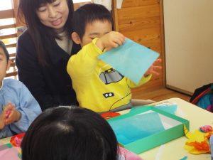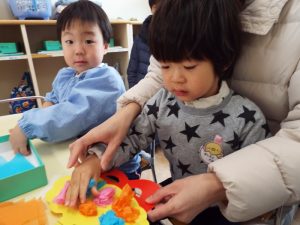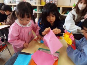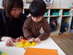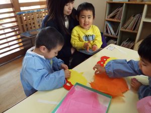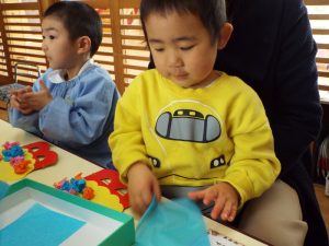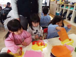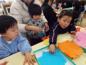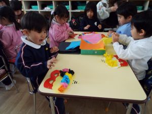 <年少組さんのお部屋では、お花紙をくるくるペッタン・・・鬼さんの髪の毛が出来上がりー!>