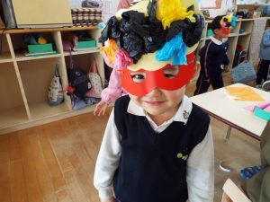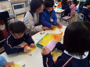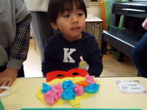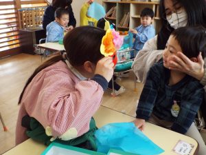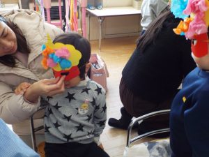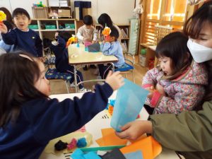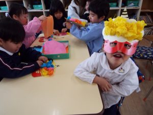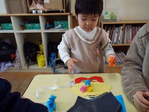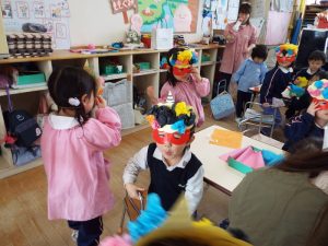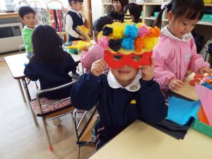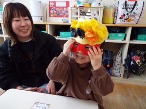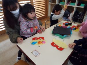 節分が近いこの時期、どのクラスも鬼のお面づくりを楽しみました。年少さんは、いろいろな色のお花紙をクルクル巻いて、鬼さんの髪の毛にしてお面に貼っていましたよ。年長さんは、新聞紙を丸めた豆を入れる入れ物を作って、紙で制作した鬼さんにお豆を投げて楽しんでいましたよ。