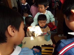 <年長さんはとっても親切。新聞紙を丸めたお豆が手作りの鬼の衝立にあたるように、一生懸命お世話していました。>