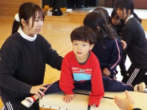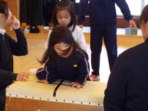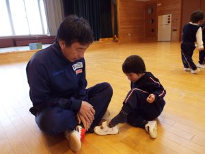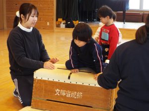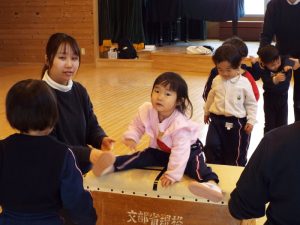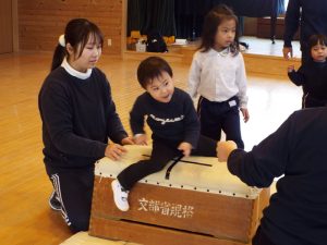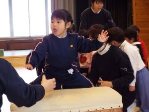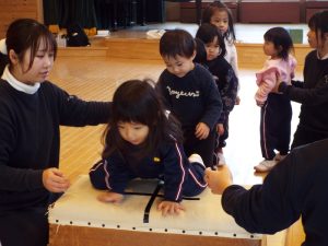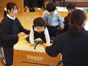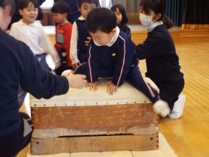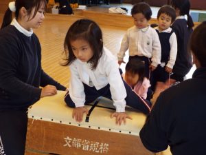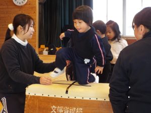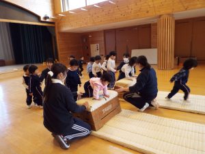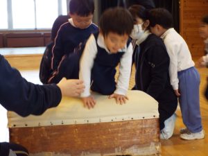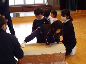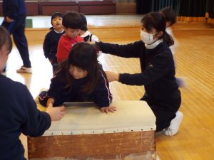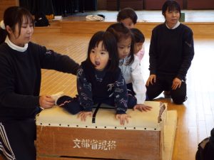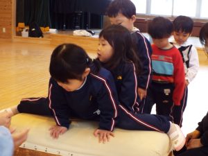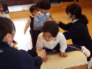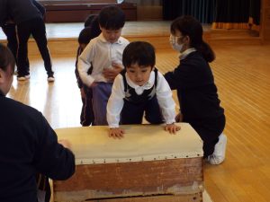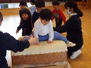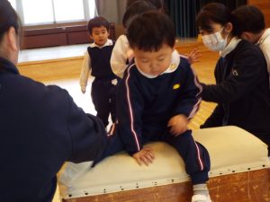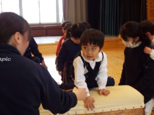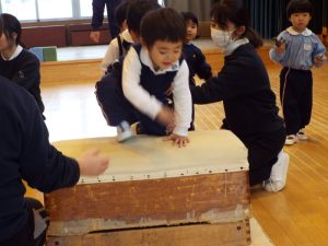 遊戯室では、いちご組さんが運動あそびの真っ最中。「跳び箱」に挑戦しているようです。誰もが、跳び箱めがけて迫力満点!なかなか挑戦的に突っ込んでいましたよ。
