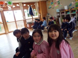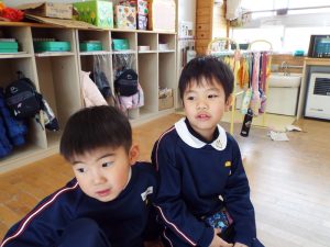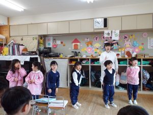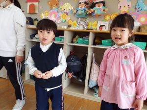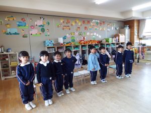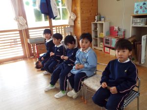 年中組さんは、今日はお休みのお友だちがたくさんいました。お部屋ではお当番が前に出て朝のご挨拶と健康観察中でした。お休みのお友だちの皆さん、早く元気になってね。