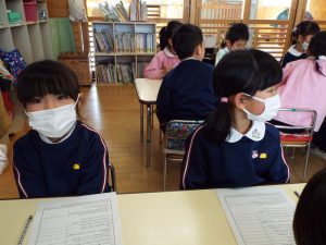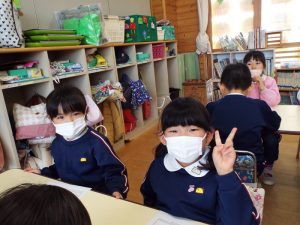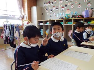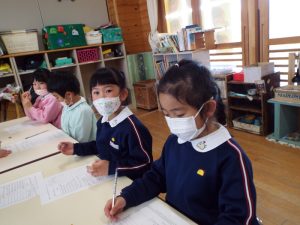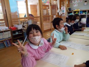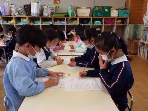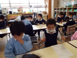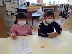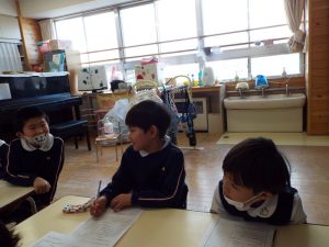 年長組は、学校評価のアンケート用紙に先生の説明を聞きながら記入をしているところでした。いよいよ幼稚園生活も終わりに近づいてきた年長組さんです。、東長野商店街のこと、運動会や発表会、50周年記念式典、自由遊びの時間に先生や友達と思い切り遊んだこと…幼稚園の生活の様々なことを思い出しながら卒園に向けての準備が始まっています。