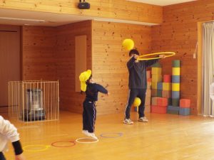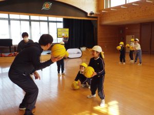 SHINSHIU BRAVU WARRIORS BASKETBALL のコーチが幼稚園で年長組を対象にしたバスケットボール教室を開いてくださいました。「めっちゃ楽しい!」「もうおわり?もっとやりたいな。」…これは教室終了後の子どもたちの声です。一人一個ずつバスケットボールが配られ、ドリブルやシュートを何回も楽しみました。篠ノ井学園ではSHINSHIU BRAVU WARRIORS と俊英高校がパートナーシップ協定を結んでいます。その関係で幼稚園でも体験教室を開いてくださいました。