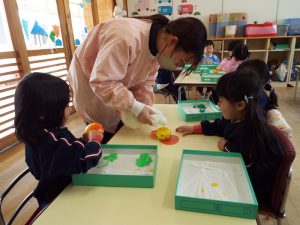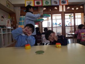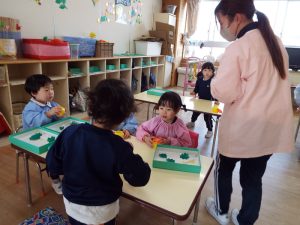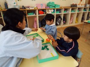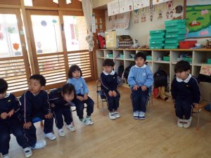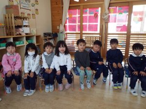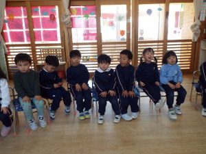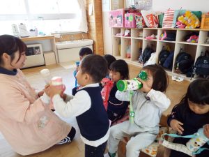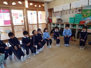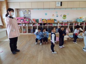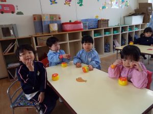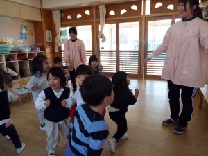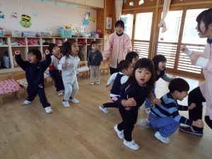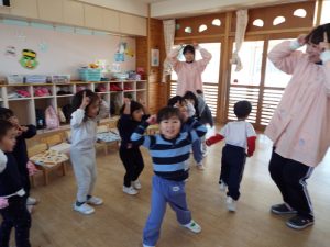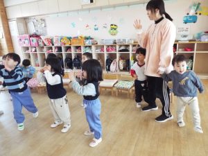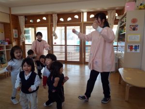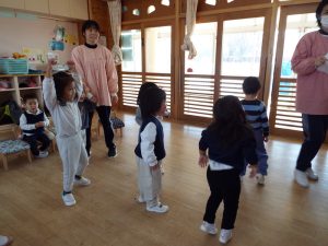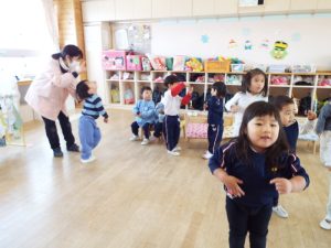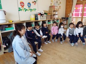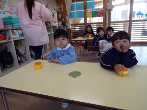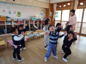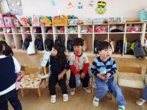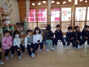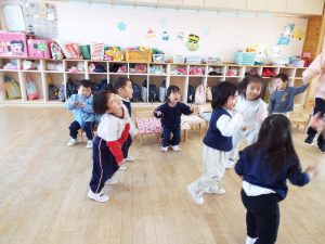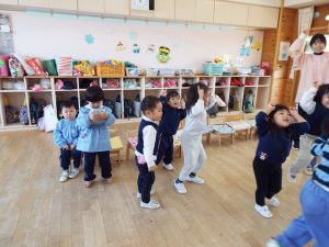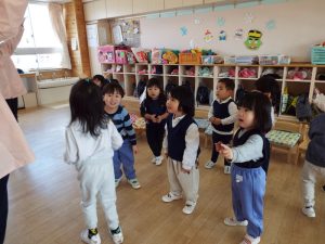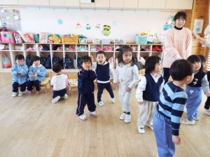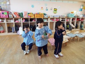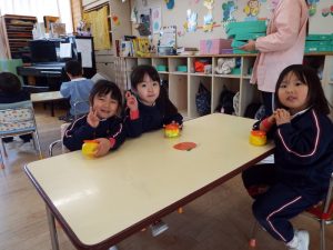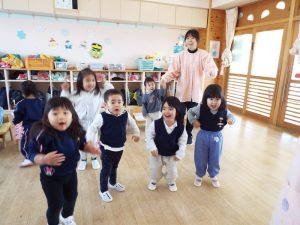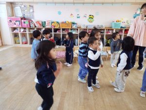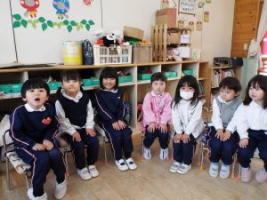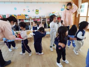ブログ 2026.02.12 いちご組〜年少組(1階のお部屋の子どもたち) <年少もも組さん〜『朝のご挨拶』お当番さん、よろしくお願いします〜><年少ばら組さん『紙を使ってお花づくり』〜ありがとうの会の準備だよ〜><いちご組〜🎵はこう はこう 鬼のパンツ🎵いっぱい踊って水筒で乾杯〜>