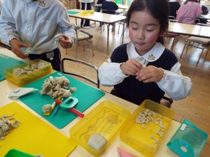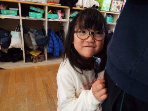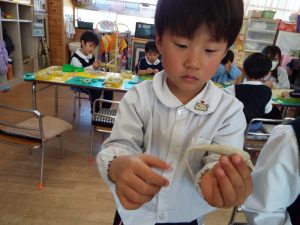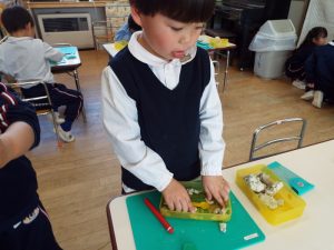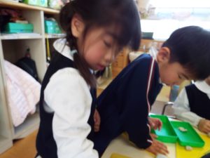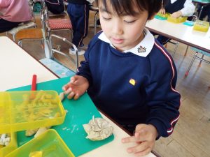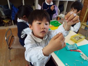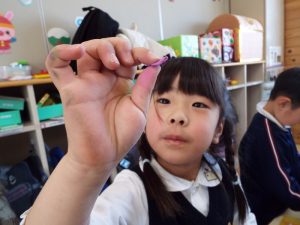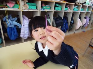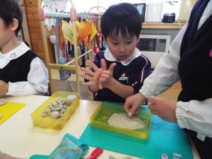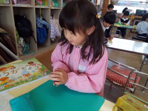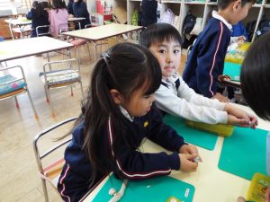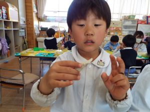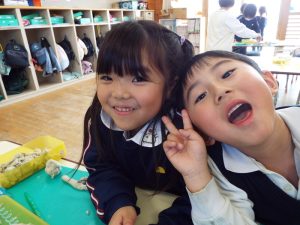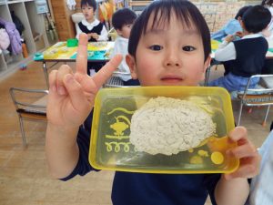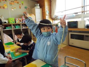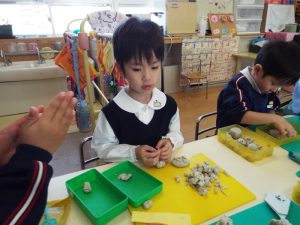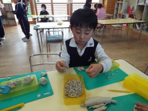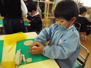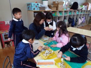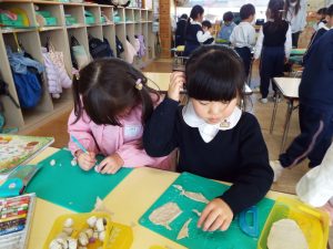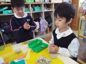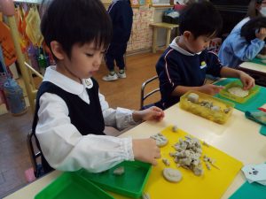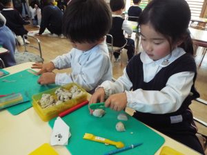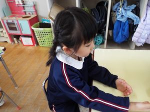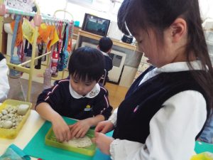 年中組は在園児の中心になって年長組さんの卒園に向けて「ありがとうの会」の企画をし、準備を進めています。今日は、会場を飾る文字に色を付けていましたが、終了した人からお友だちと粘土あそびを楽しんでいました。