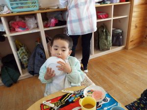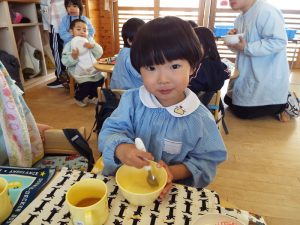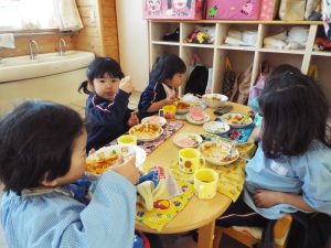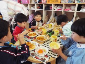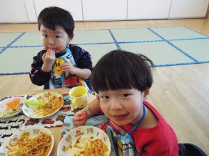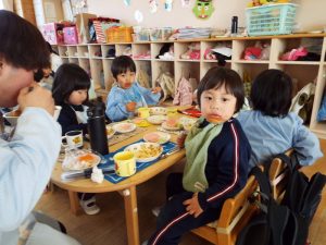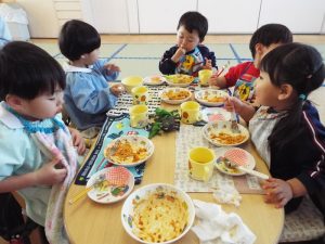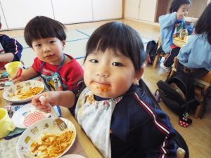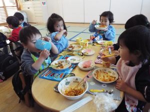 いちご組さんのお部屋では給食を食べている真っ最中。さて、今日のメニューは何かな?子どもたちの写真を見ると分かりますよ。