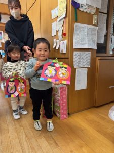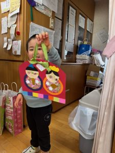 タムタム教室のお友だちは親子で素敵なおひなさまづくりを楽しみました。おひなさまの顏はタムタム教室のお友だちが描きました。切ったり貼ったりしておひなさまの素敵な壁飾りの出来上がりです。職員室の先生方にも見せてくれました。きっと今頃はお家のお部屋に飾られていることでしょう。おひなさまを制作した後は、幼稚園の給食体験です。今日のメニューはハンバーグとひじきサラダ、野菜スープ。「おいしかったよ。」と教えてくれたお友だちもいましたよ。