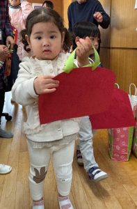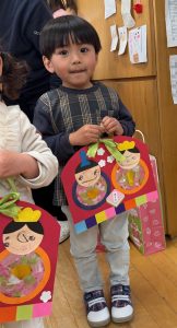 タムタム教室のお友だちは親子で素敵なおひなさまづくりを楽しみました。おひなさまの顏はタムタム教室のお友だちが描きました。切ったり貼ったりしておひなさまの素敵な壁飾りの出来上がりです。職員室の先生方にも見せてくれました。きっと今頃はお家のお部屋に飾られていることでしょう。おひなさまを制作した後は、幼稚園の給食体験です。今日のメニューはハンバーグとひじきサラダ、野菜スープ。「おいしかったよ。」と教えてくれたお友だちもいましたよ。